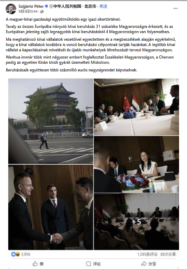2025年93日,匈牙利外交與對外經(jīng)濟部長西雅爾多在北京參加完紀(jì)念中國人民抗日戰(zhàn)爭暨世界反法西斯戰(zhàn)爭勝利80周年閱兵活動后,同在匈牙利投資的中國主要公司領(lǐng)導(dǎo)人進行了會談。